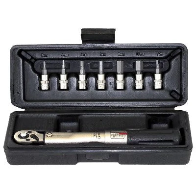 Le couple de serrage de cette clé peut se régler entre 2 et 24 newtonmètres. Lorsque le couple est atteint, le manche va légèrement se décaler sur le côté avec un clic sonore. C’est le signe qu’il ne faut pas aller plus loin ! Elle possède un cliquet réversible. Cette boîte est composée de 6 clés Allen et d’une clé Torx à 6 branches. Visualisez le manuel d’instruction de la clé en français.