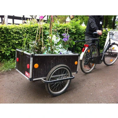 Cette remorque de 25 kg se fixe au vélo par une boule d’attelage au niveau de la tige de selle. Elle supporte alors un chargement de 40 kg max. La remorque Jumbo Roland est aussi tractable à pied. Elle dispose d’une poignée sur la barre de fixation qui permet de transporter alors jusqu’à 100 kg de marchandises à la main.